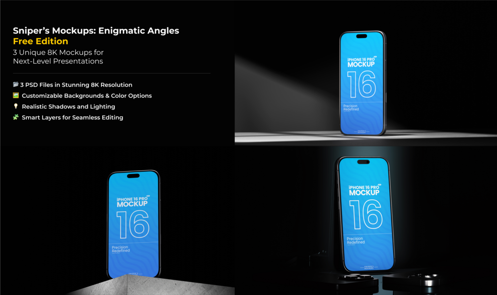 With Sniper's Mockups: Enigmatic Angles Premium Pack, you get more than just a mockup—you get a professional toolset designed to save time, impress clients, and enhance your creative vision.